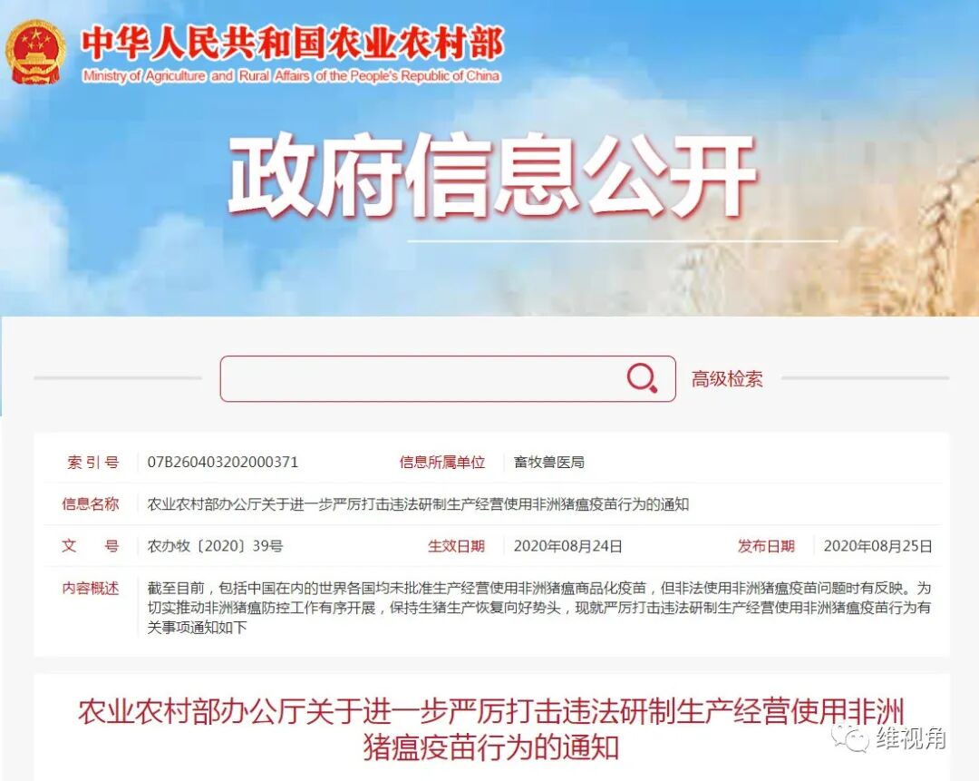 截至目前,包括中国在内的世界各国均未批准生产经营使用非洲猪瘟商品化疫苗,但非法使用非洲猪瘟疫苗问题时有反映。为切实推动非洲猪瘟防控工作有序开展,保持生猪生产恢复向好势头,现就严厉打击违法研制生产经营使用非洲猪瘟疫苗行为有关事项通知如下。
